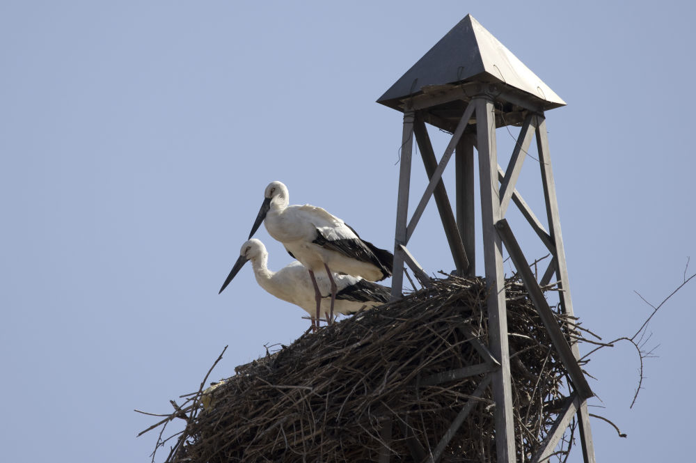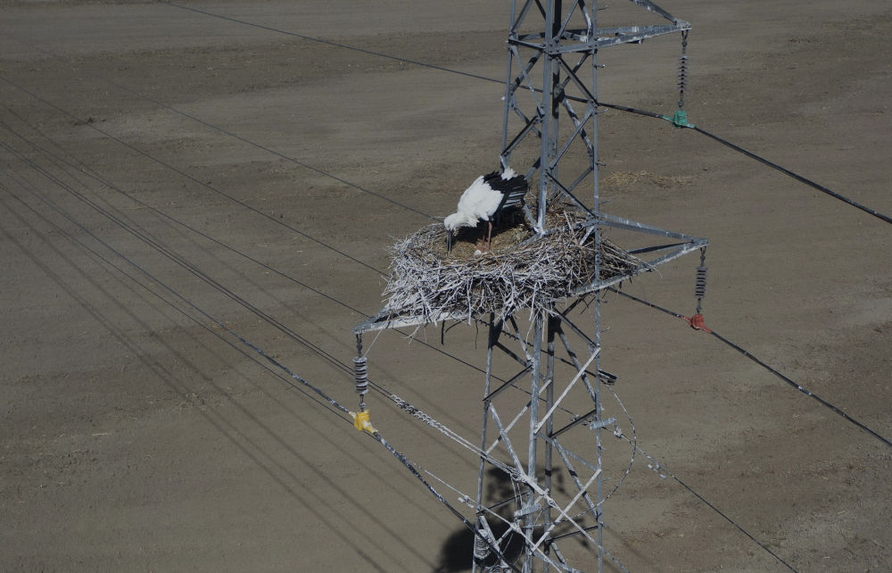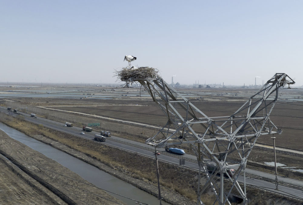 ↑3月19日,东方白鹳在唐山市丰南区沿海湿地铁塔上的巢穴里。新华社记者 杨世尧 摄