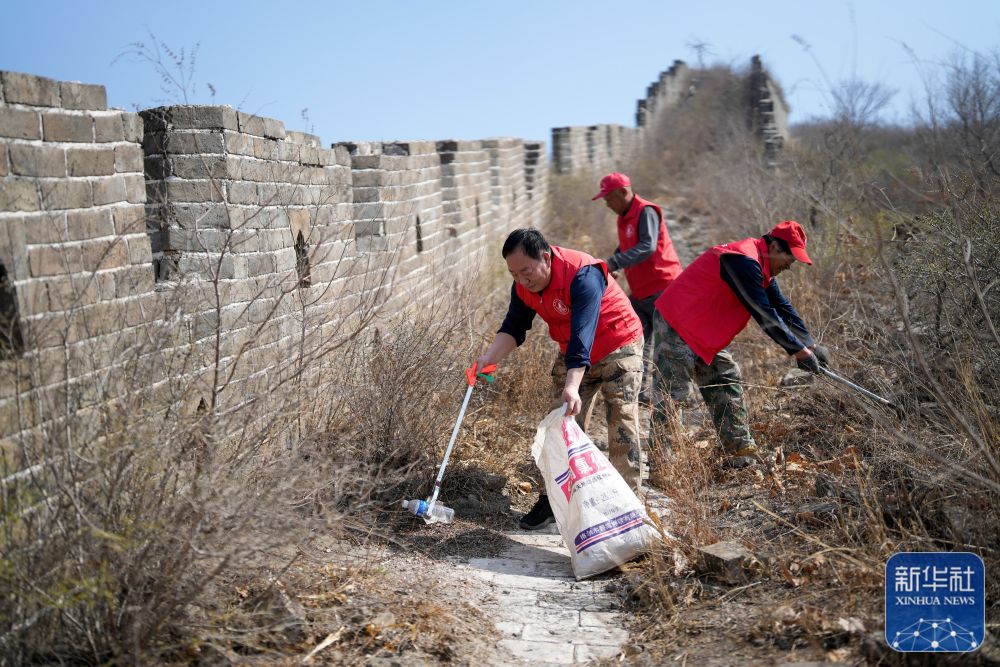 3月29日,柴继志(前)和其他队员在长城上清理垃圾、树枝。