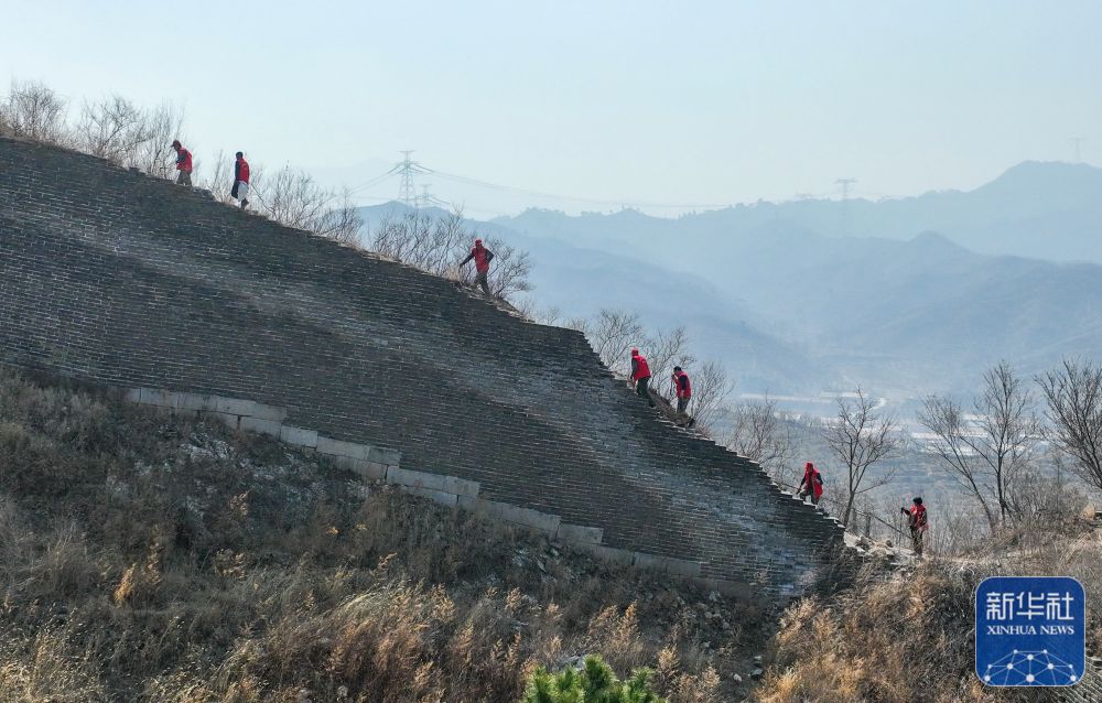 3月29日,“洪山口长城保护小分队”队员在长城上清理垃圾、树枝(无人机照片)。