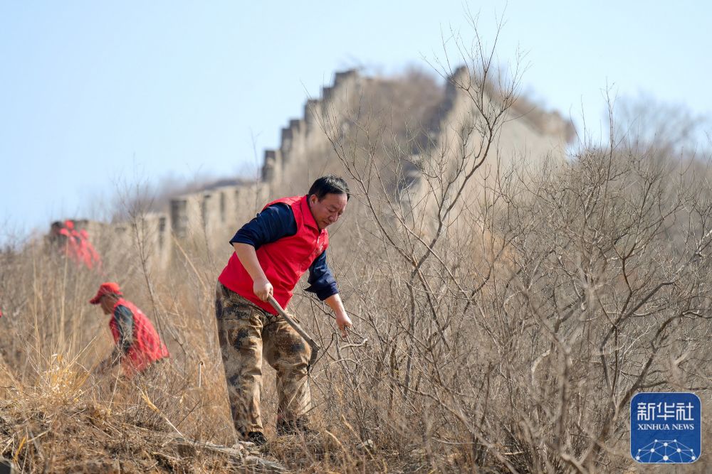 3月29日,“洪山口长城保护小分队”队员在长城上清理树枝。