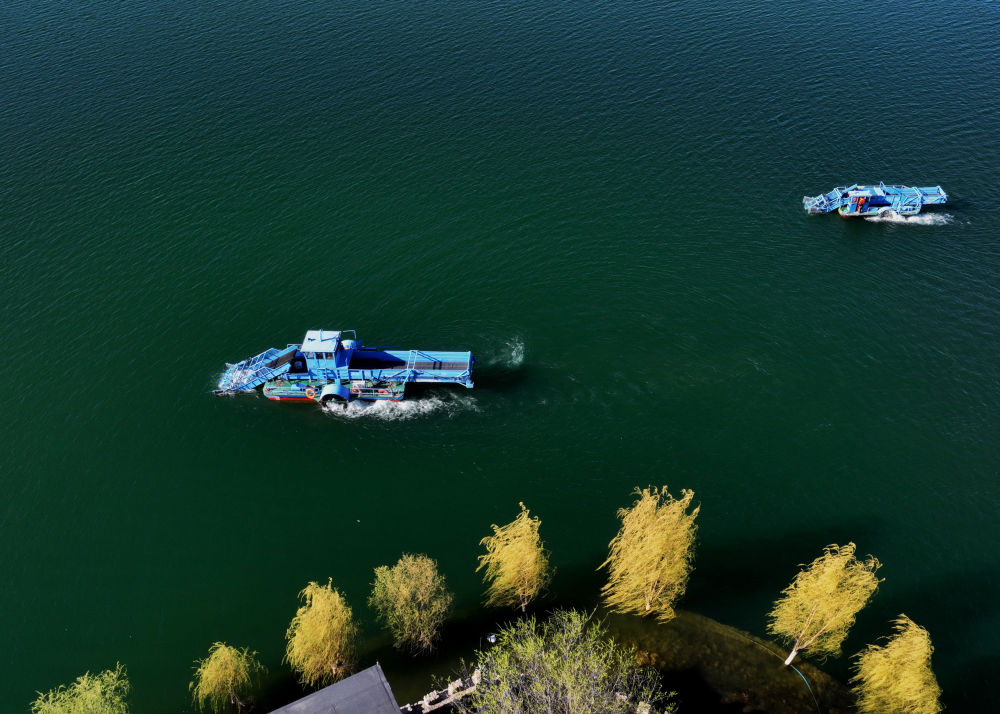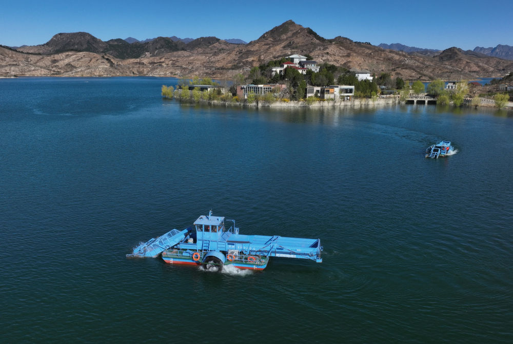 ↑4月7日,河北省遵化市上关湖管理部门的工人操作专业打捞船在湖面上作业(无人机照片)。新华社记者 杨世尧 摄