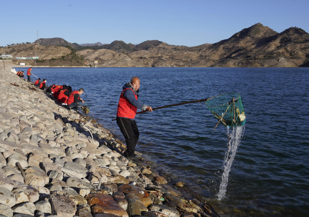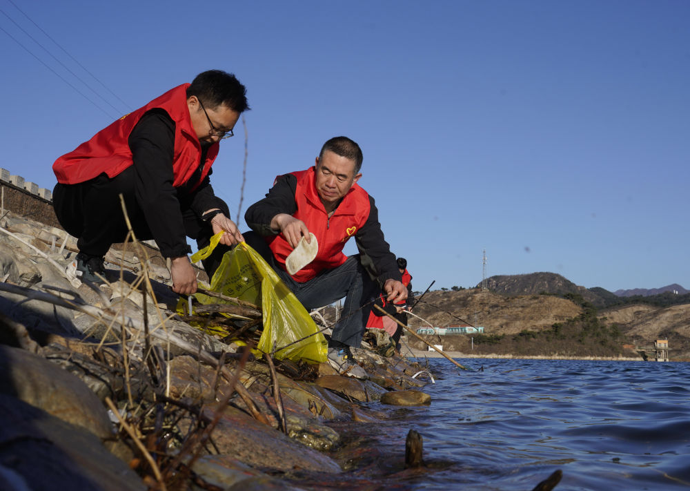 ↑4月7日,河北省遵化市汤泉满族乡的志愿者在上关湖岸边清理杂物。新华社记者 杨世尧 摄