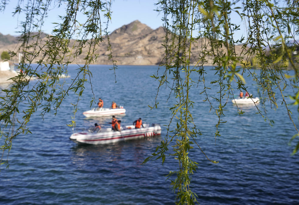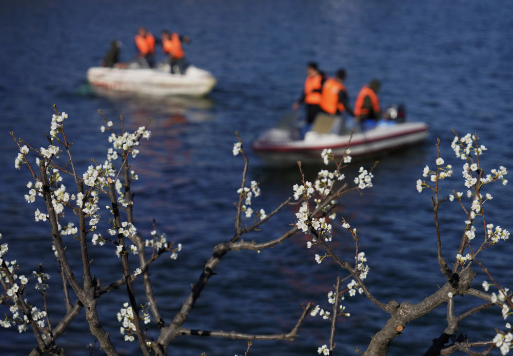 ↑4月7日,河北省遵化市上关湖管理部门的工人在打捞湖面漂浮物。新华社记者 杨世尧 摄