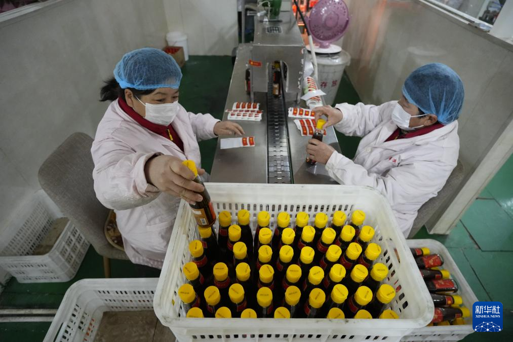 12月29日,河北省滦州市邸庄村一家香油生产企业的工人在为产品贴标签。