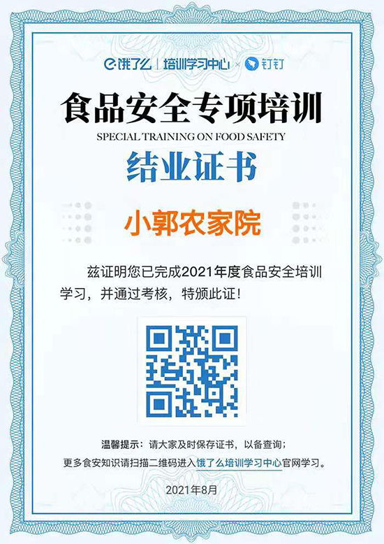 我辖区内餐饮服务单位食品安全负责人及其从业人员积极参加线上培训,考试获得阿里巴巴本地生活(饿了么)平台认证的餐饮服务食品安全培训证明。