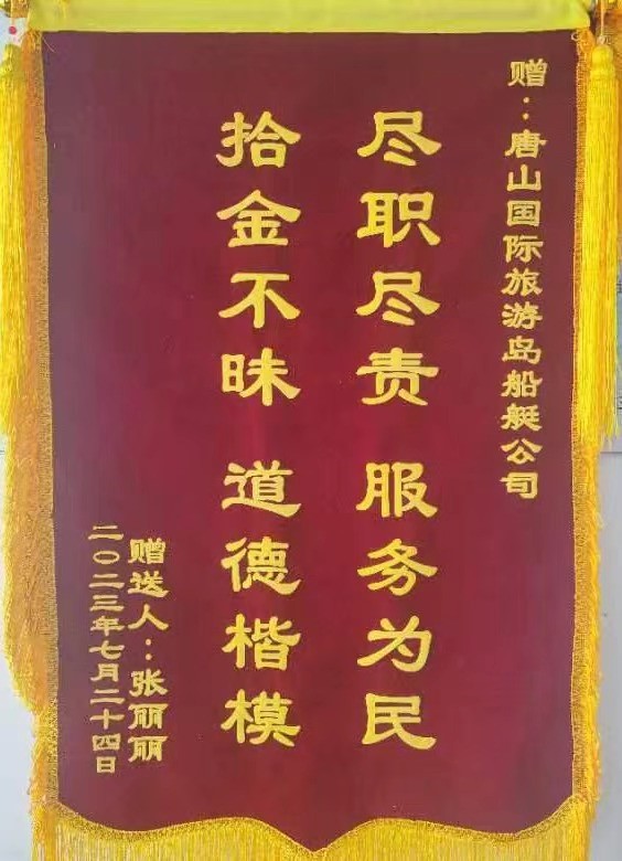 随着旅游旺季的到来,三贝明珠码头停车场及客运大厅内人潮涌动,游客遗失物品事件时有发生,船艇公司员工已先后拾到钱包(内有人民币2000余元、银行卡、身份证)、手表、手机等贵重物品,并多方寻找失主及时将物品返还,受到了游客的高度赞扬。有游客为感谢船艇公司员工这种拾金不昧的精神,特意为公司送来了锦旗,锦旗上:“尽职尽责、服务为民”正是员工周到服务、拾金不昧的真实写照。公司好人好事不断涌现,用实际行动积极传递正能量。员工始终坚持以优质、周到、热情的服务标准迎接游客,不断提升旅游服务质量和接待水平,确保游客开心而来,满意而归。